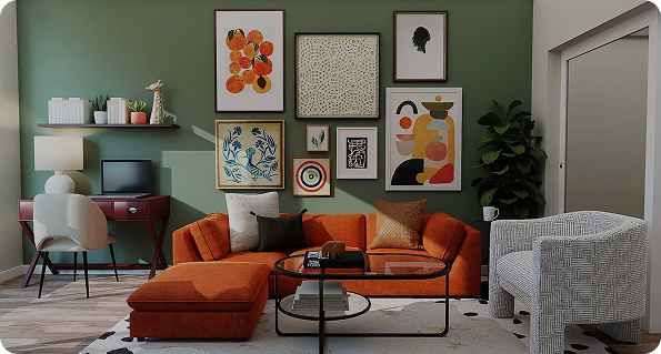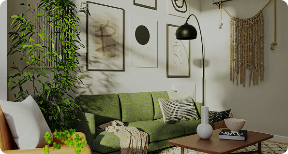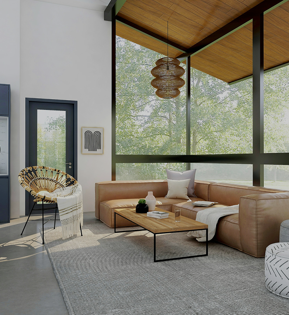 Muted tones, large glass, solid doors, leather upholstery, desert plants, accent pillows, wooden accents.